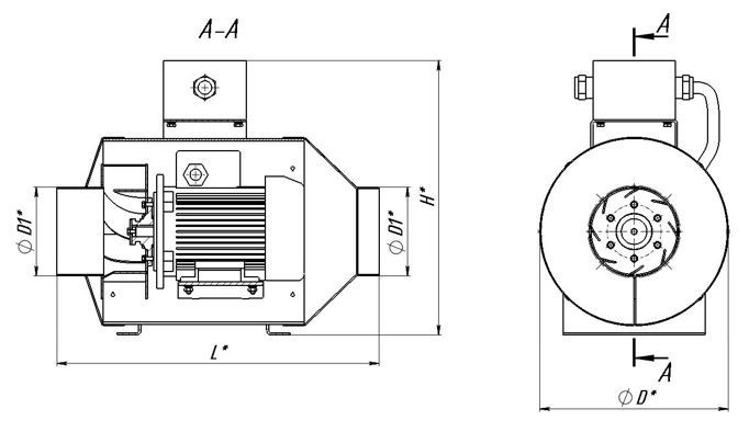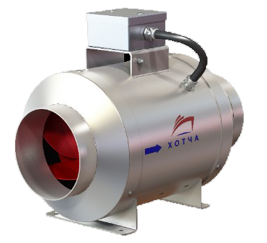 Корпус вентилятора имеет цилиндрическую форму, электродвигатель расположен внутри корпуса.