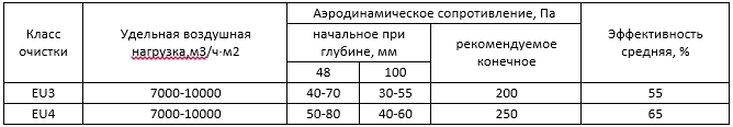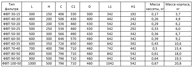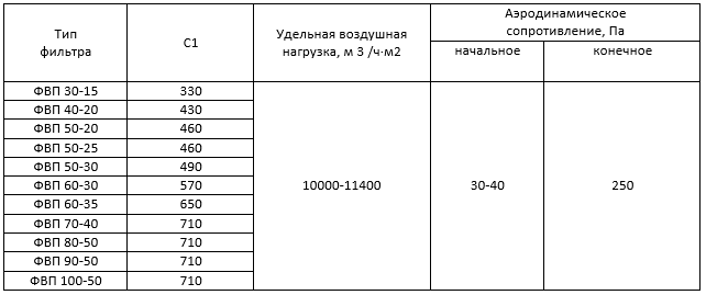 Технические характеристики фильтров типа ФВП (класс очистки EU3)