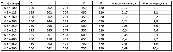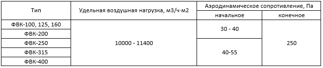 Технические характеристики фильтров типа ФВК (класс очистки EU3)