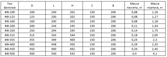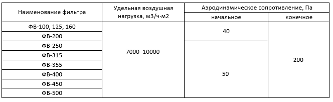 Технические характеристики фильтров типа ФВ (класс очистки EU3) :