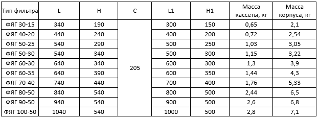 Технические характеристики фильтров типа ФЯГ (класс очистки EU3)